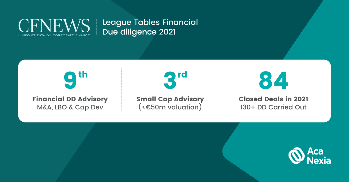 CFNEWS' latest League Tables Financial Due Diligence ranking features Aca Nexia with 84 deals closed (130+ due diligences carried out), accounting for a 50% growth in activity. This outcome supports the firm's position as a leading specialist in Transaction Services in France, ranking 9th in M&A, LBO and Expansion Capital transactions, and amongst the top 3 for companies valued up to €50m across all markets.