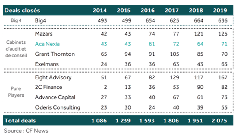 Present for more than 10 years in the rankings of the profession, Aca Nexia thus confirms its dynamics and its position as a recognized player in Transaction Services in France by its presence, one new time, in the Top10 of the CFNews ranking. It is immediately behind the Big 4, and presents itself as a credible alternative to large firms, thanks to its multidisciplinarity (audit and advice), its track record (more than 200 operations in the last 3 years) and its capacity international projection wiht the Nexia International network, ranked 9th worldwide.