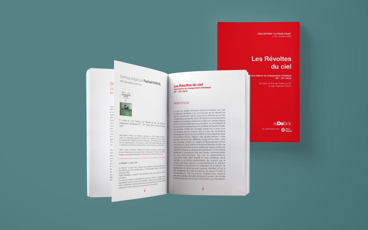 Ce 19ème « Lu pour vous », édité par le think tank leDoTank, en partenariat avec Aca Nexia, étudie la manière dont, au long de l’histoire, les sociétés occidentales se sont intéressées à la question du changement climatique d’origine anthropique. Fabien Locher et Jean-Baptiste Fressoz, historiens et chercheurs au CNRS, défendent l’idée que le récit usuel, qui fait du changement climatique une préoccupation récente, serait inexact. Selon les deux auteurs, les sociétés européennes auraient été inquiétées par l’impact de l’activité humaine sur l’environnement dès le XVe siècle, mais auraient laissé de côté cette question à la fin du XIXe au profit de la certitude d’une stabilité climatique de long terme.